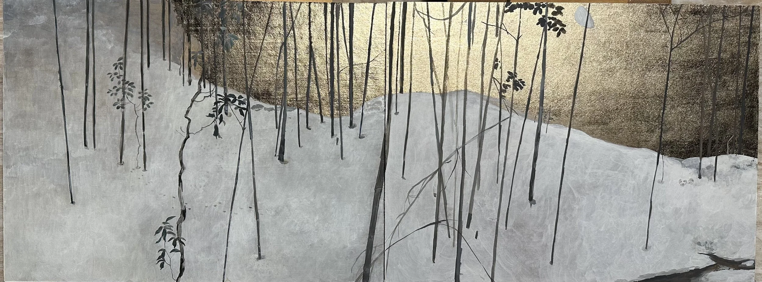 Each painting in the series captures the subtle transitions of the natural world: air moving across water, light dissolving into snow, shadow passing through branches. These are not dramatic moments but modest ones, easily missed. Tapley’s gift lies in her ability to hold such transience with extraordinary stillness. Her paintings operate at the threshold between perception and memory, between the world as it appears and the world as it is carried within the mind. Time does not advance in these works so much as it settles.