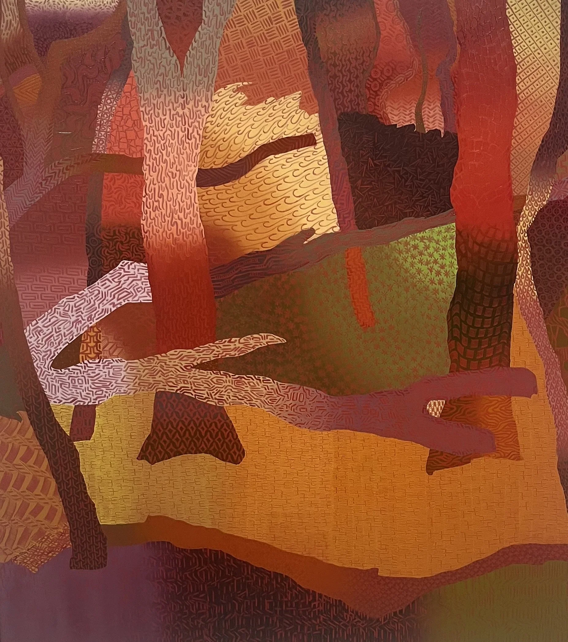 Site-specific color palettes generate purple trees, red grass, and kaleidoscopic skies. The influence of the Fauvists, with their incongruent color, is present, as is a sense of disorientation drawn from memory rather than realism. These are not imagined landscapes, they are observations shifted out of alignment, closer to psychological truth than visual fact.