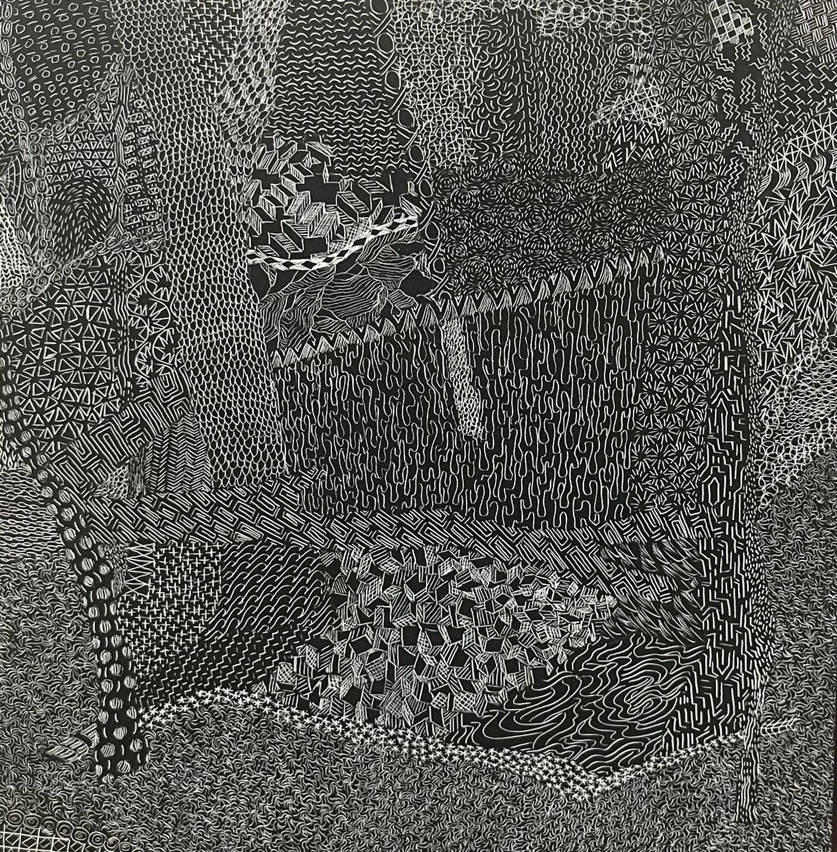 Schade’s use of pattern, camouflage, and pareidolia, where perception invents meaning, creates deliberate ambiguity. Influenced by his wife Zoe’s work on pattern theory, Schade uses repeating lines and shapes that dissolve rather than reinforce object reality. Specific patterns may recur in a single space, but they never repeat across the canvas, heightening a sense of the unknown.