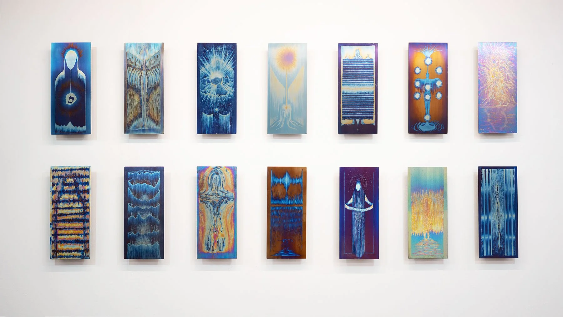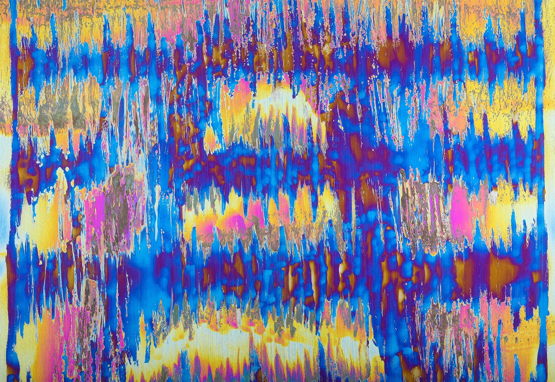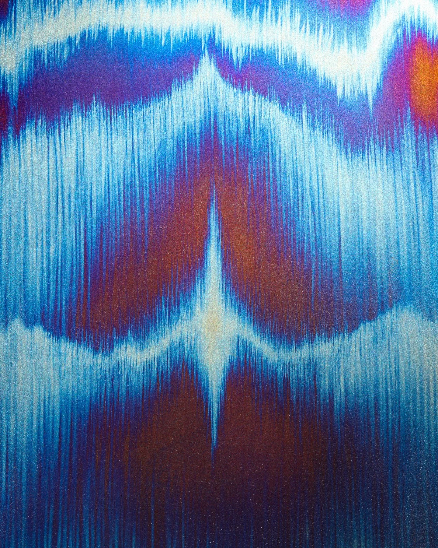S: My current body of work is focused on the unification of the material and the immaterial through the use of raw electrical voltage as both a visual and sonic medium of art. I apply fluctuating voltage to titanium sheets in my visual practice, and through my multidisciplinary project Sestra Kuya, in collaboration with sound artist Gerry Gonzales, these same electrical fluctuations are transmitted into live sound. This process is extremely sensitive and responsive to even the smallest shifts in movement, pressure, or energy. With no need for paints or dyes, I am able to be fully immersed in the act of painting without the interruption of mixing color. The process demands an intense level of presence due to its sensitivity - and its inherent danger. In my solo visual practice, I work through making small vertical marks that resemble frequencies. They appear unintentionally, as I try to let my hand move without control, much like the natural rhythm of breathing. A recurring subject in my work is the appearance of abstracted figures. They often seem to dissolve into their surrounding space, as if it is impossible to tell where the figure ends and the field begins. For me, this reflects the quantum, continuous, and unifying field that we are all part of. Light and color play an essential role in this practice. In electricity painting on titanium, I am limited to a specific range of colors determined by electrical voltages. Creating contrast and variation within this limited palette has been both challenging and deeply engaging - a field I continue to refine. Because the paintings are made on titanium, they are highly reflective and responsive to light. On a physical level, their colors literally change as they react to different angles of illumination, causing each piece to shift in appearance depending on placement, movement, and time of day.