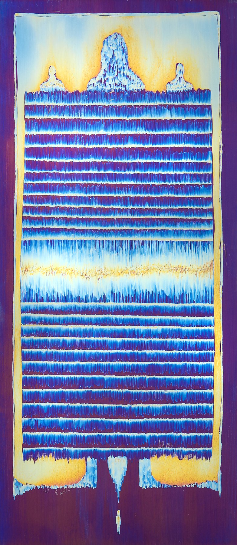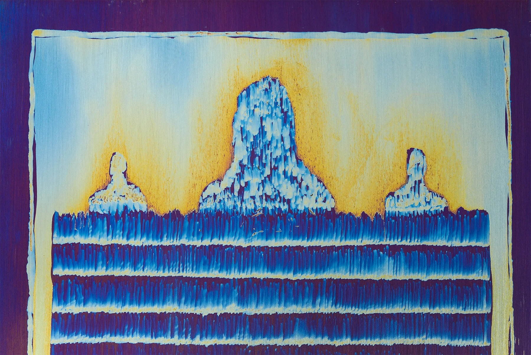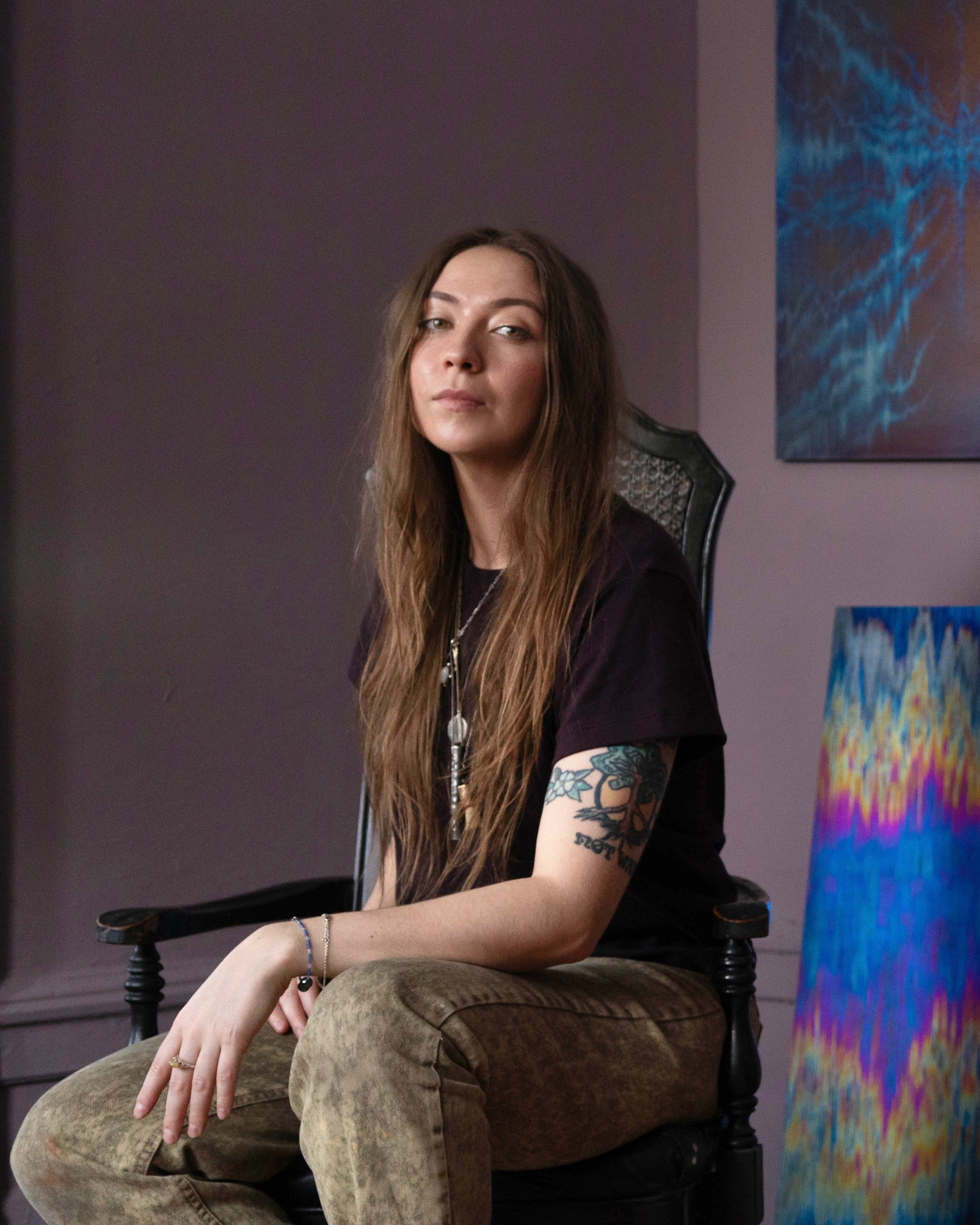 S: My current body of work is focused on the unification of the material and the immaterial through the use of raw electrical voltage as both a visual and sonic medium of art. I apply fluctuating voltage to titanium sheets in my visual practice, and through my multidisciplinary project Sestra Kuya, in collaboration with sound artist Gerry Gonzales, these same electrical fluctuations are transmitted into live sound. This process is extremely sensitive and responsive to even the smallest shifts in movement, pressure, or energy. With no need for paints or dyes, I am able to be fully immersed in the act of painting without the interruption of mixing color. The process demands an intense level of presence due to its sensitivity - and its inherent danger. In my solo visual practice, I work through making small vertical marks that resemble frequencies. They appear unintentionally, as I try to let my hand move without control, much like the natural rhythm of breathing. A recurring subject in my work is the appearance of abstracted figures. They often seem to dissolve into their surrounding space, as if it is impossible to tell where the figure ends and the field begins. For me, this reflects the quantum, continuous, and unifying field that we are all part of. Light and color play an essential role in this practice. In electricity painting on titanium, I am limited to a specific range of colors determined by electrical voltages. Creating contrast and variation within this limited palette has been both challenging and deeply engaging - a field I continue to refine. Because the paintings are made on titanium, they are highly reflective and responsive to light. On a physical level, their colors literally change as they react to different angles of illumination, causing each piece to shift in appearance depending on placement, movement, and time of day.