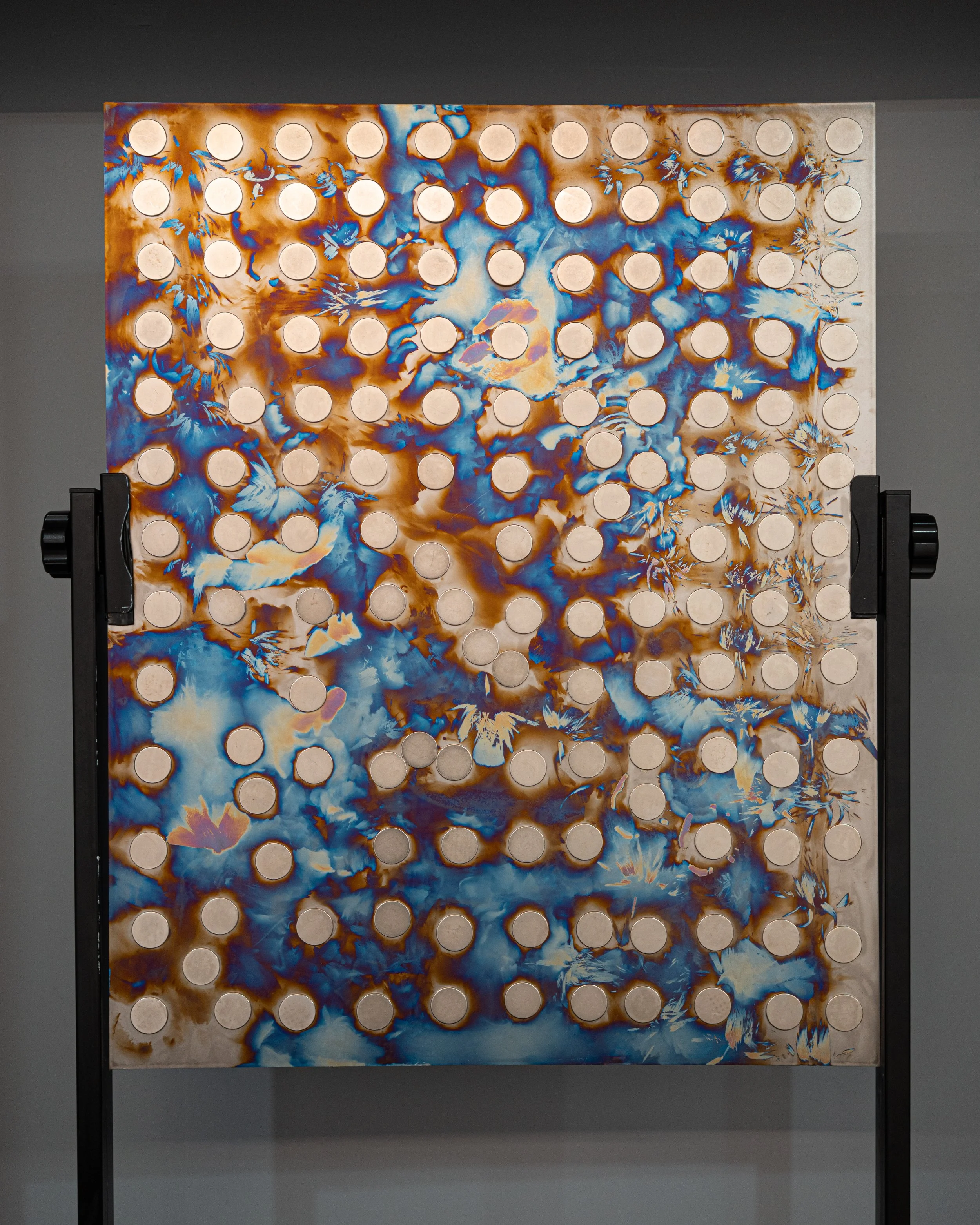 S: In my visual art practice, I have developed a unique approach to applying electrical voltage onto titanium with a brush. Over time, I have expanded this technique into creating my own methods of electrical bathing and blocking the surface from receiving voltage as a way of forming color contrast within a system of color application that can only move upward in voltage. Currently, the most significant invention in my practice is the electrical circuit that I developed and engineered with Gerry Gonzales in March 2025 to transmit the fluctuating electrical voltage that I paint with into sound. This moment marked a complete breakthrough in my work, opening a direct bridge between visual and sonic form. We continue to refine and expand the possibilities of this evolving medium. Because our practice is rooted in invention, craft becomes not a choice but a necessity. Everything must be custom built and carefully designed: from the circuit itself to the tools, presentation, and even the language we use to describe it. We created the term Anophony to name this new form: a sonic and visual artwork created by applying fluctuating electrical voltage to titanium and transmitting that same circuit into sound. Each component requires precision and sensitivity to ensure that the system remains both functional and expressive. At the moment, we are focused on advancing the circuit’s capabilities and developing custom tools, such as specialized brushes that allow me to paint and connect to electrical voltage seamlessly. We are also experimenting with new mounting systems for the final works and reimagining how sound and image can coexist as one integrated form.