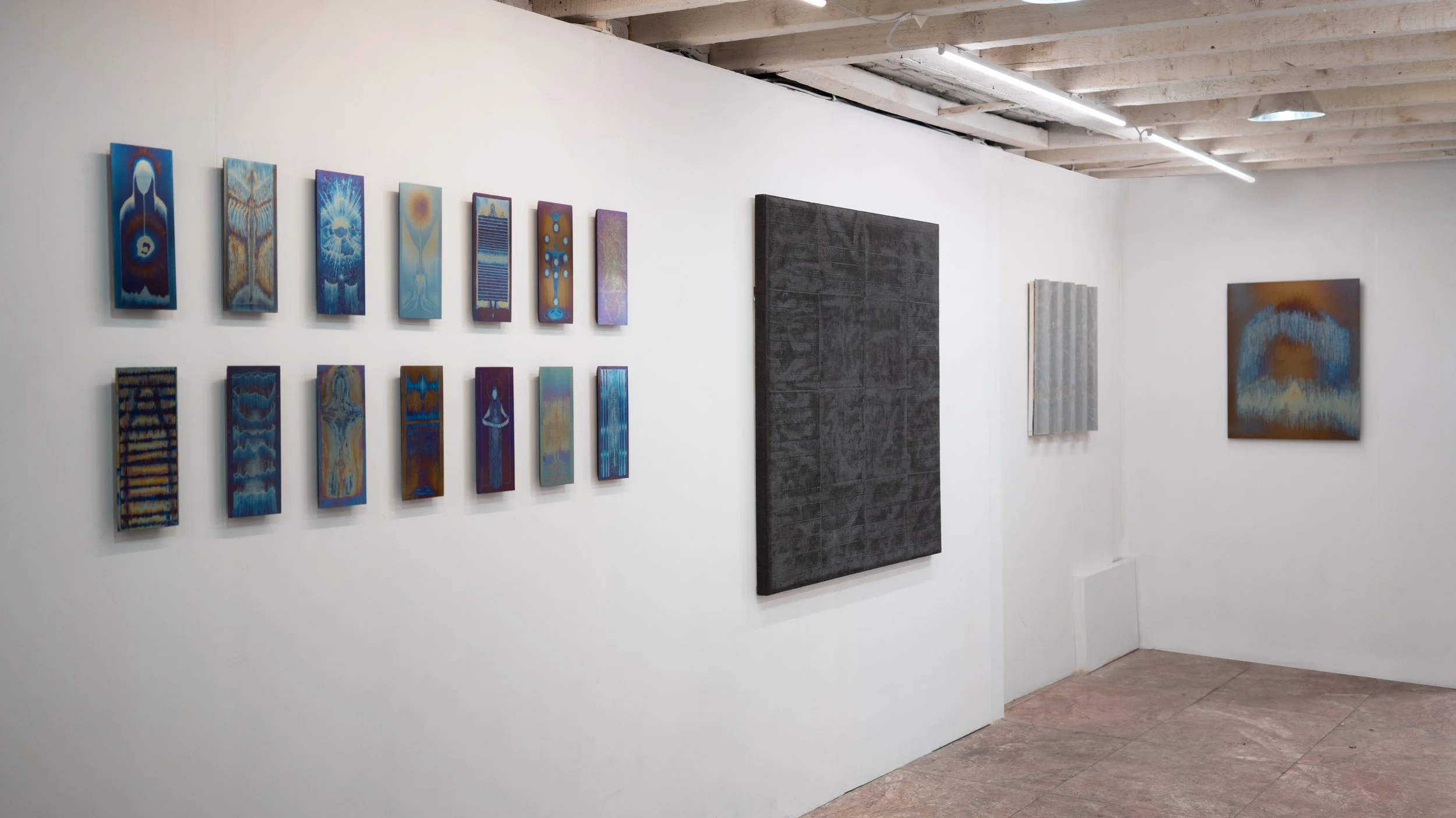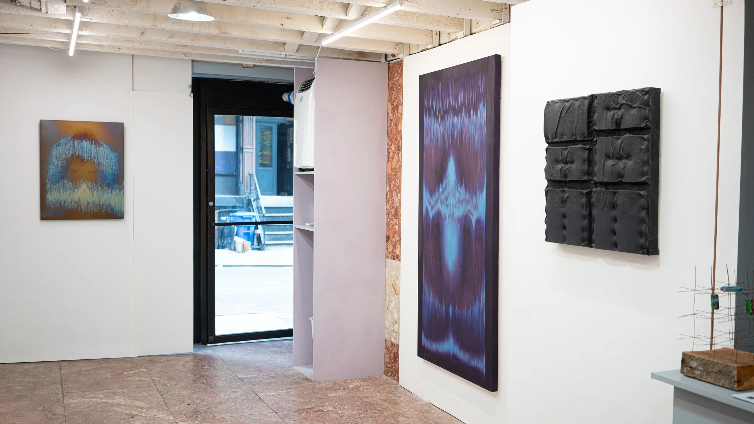 I had the pleasure of interviewing New York based artists Ryan DaWalt and Si Golraine at Gloria’s Project Space during their exhibition, encountering two distinct practices linked by a shared engagement with electromagnetism. Working through live electrical current, Si Golraine channels voltage through an electrified brush, using a conductive medium on titanium to translate energy directly into colored patina. Her process is durational and present, less about control than attunement, riding electromagnetic flow as it moves through body, tool, and surface. This work frequently unfolds in dialogue with sound, including live performance with musician, composer, and producer Gerry Gonzales. Together, as Sestra Kuya, Golraine and Gonzales invented and engineered a custom process in which raw electricity, applied through a brush to titanium sheets, generates shifting colors while the same current is transmitted into sound through modular synthesis. The result is a simultaneous act of visual and sonic creation.