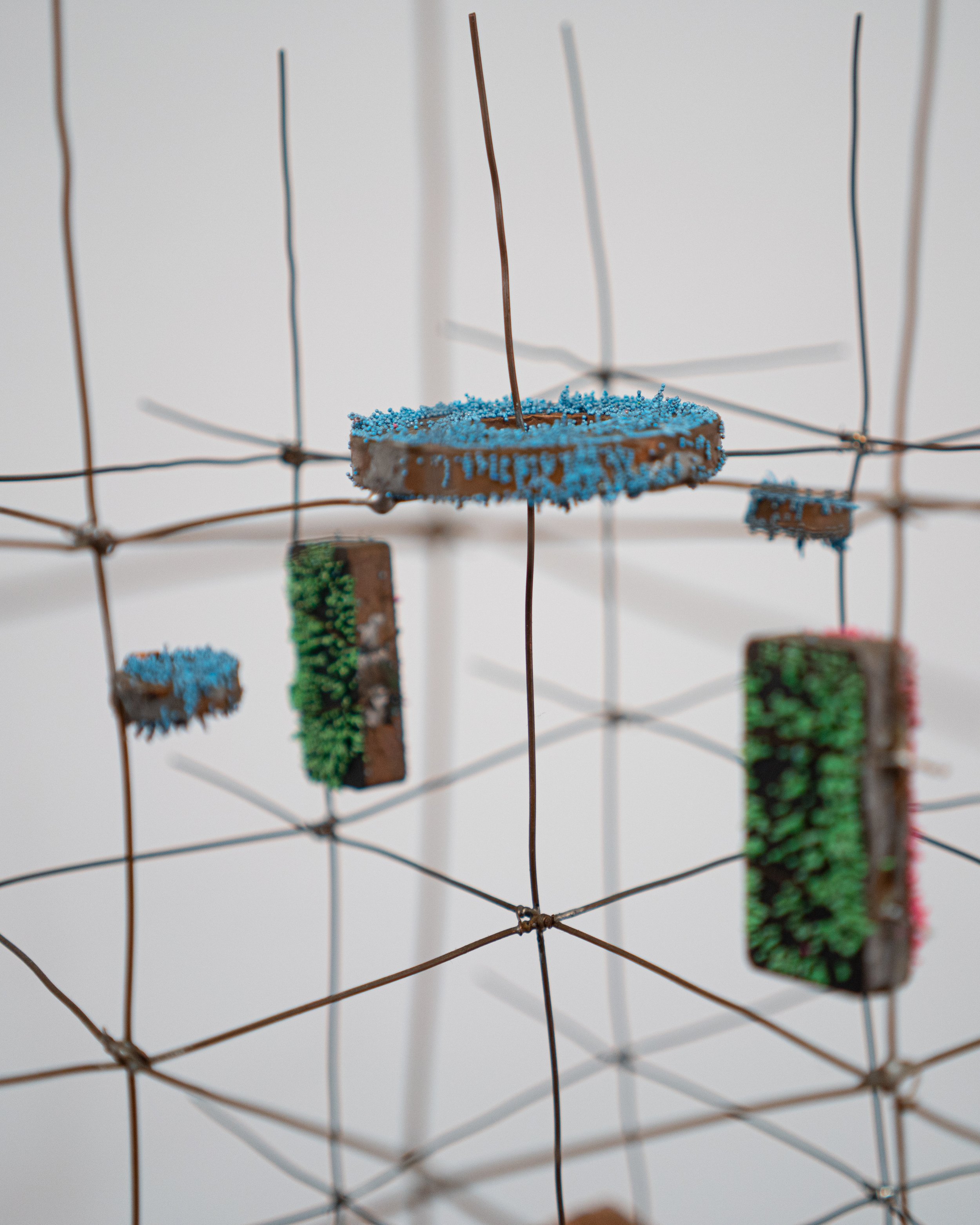 R: Repetition, pattern, sound, duration, and texture all lend themselves to sound and image. Sound has informed my work since high school, when I began carving fiddleheads in wood. I began making simple instruments or sculpting compositions with taut wire across them that were both line and sonic. I am not so interested in translation between visual and sonic codes as I am in them working together fluidly. I am not trying to make a visual thing that is sonic, but I am interested in making an object that can be seen and listened to or played as a soundscape. There was a durational aspect in both the making of and the viewing of the installation Psychic Screen, installed at VSOP in 2020. The works required being lit by ultraviolet light but would shift from ambient light from the surrounding windows, which would slowly shift to phosphorescing when the light changed in the evening.